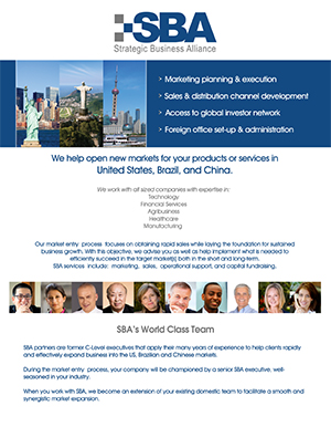 SBA opens new market opportunities in the U.S., Latin America, and China. Our multinational C-level team has hands-on experience as well as an extensive network of executive decision makers.